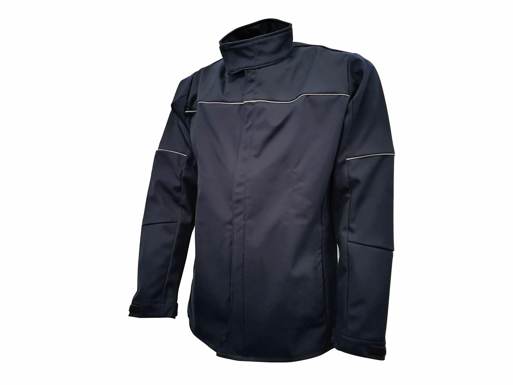 softshell avec col officier allongé avec velcro, fermeture devant à tirette profondement caché, 2 poches de côtés insérées avec tirette caché, manches insérées avec pièces confort, biais en matière rétro réfléchissants Loxy 9801FR sur le devant, dans le dos et aux manches, manches avec pat et velcro