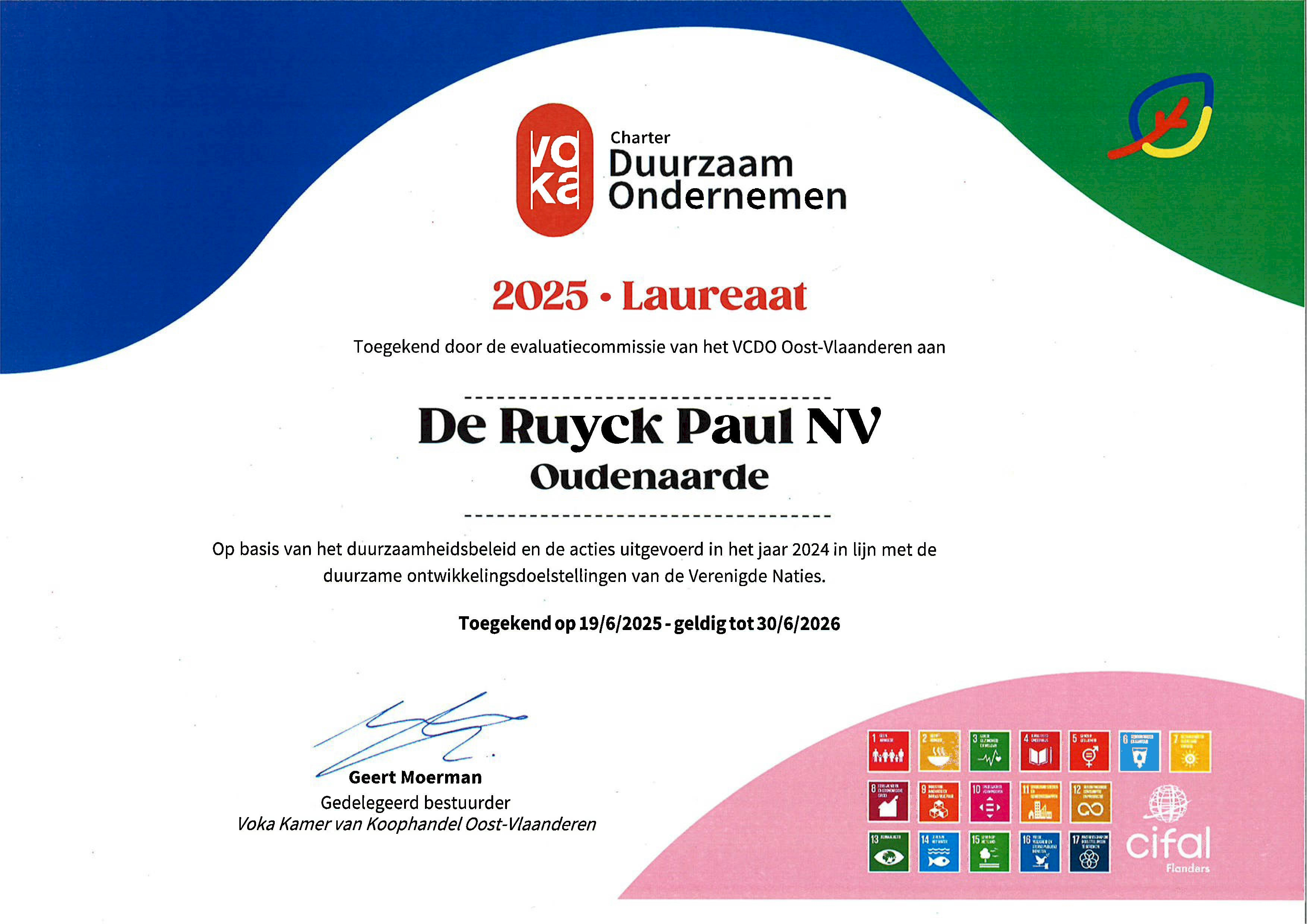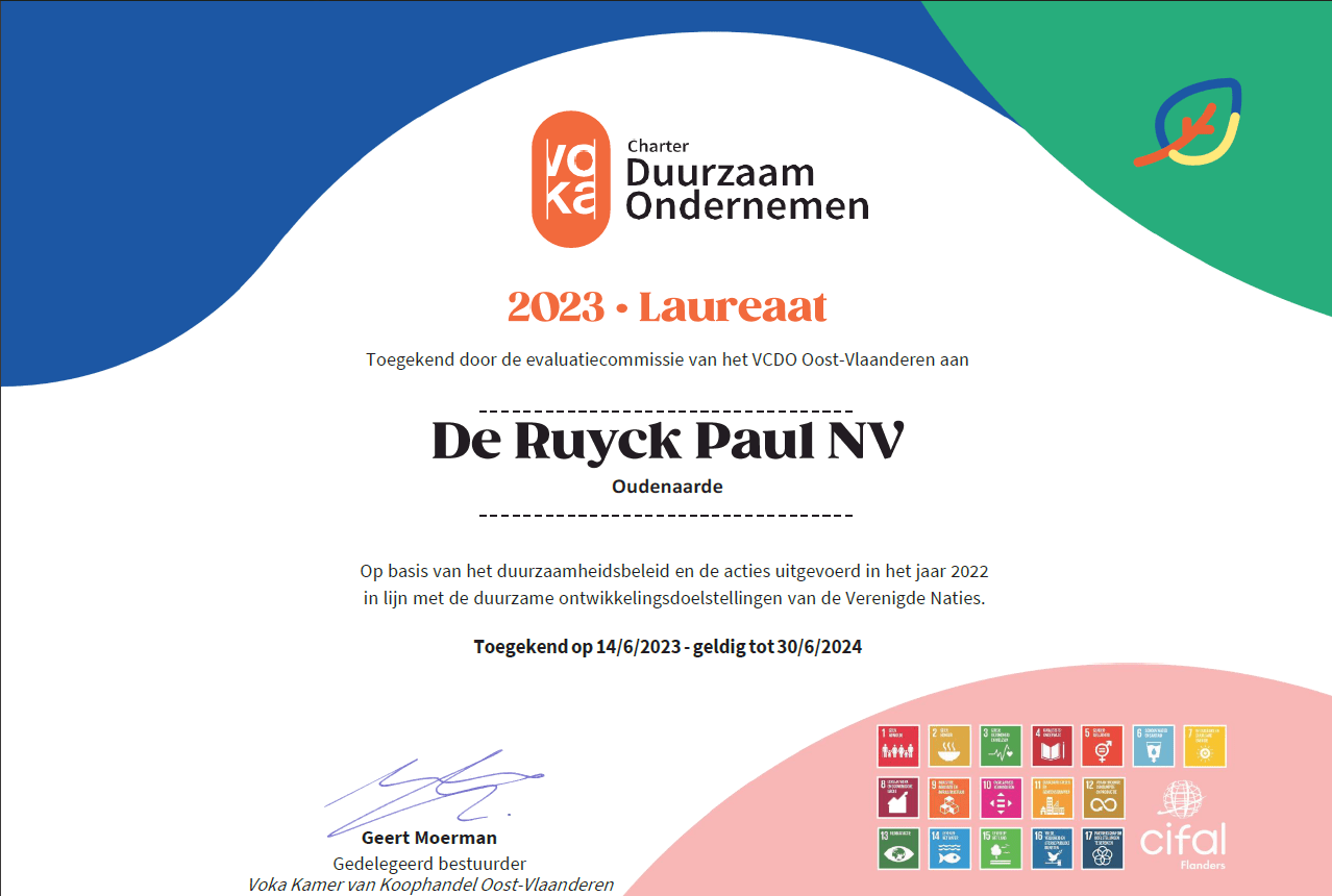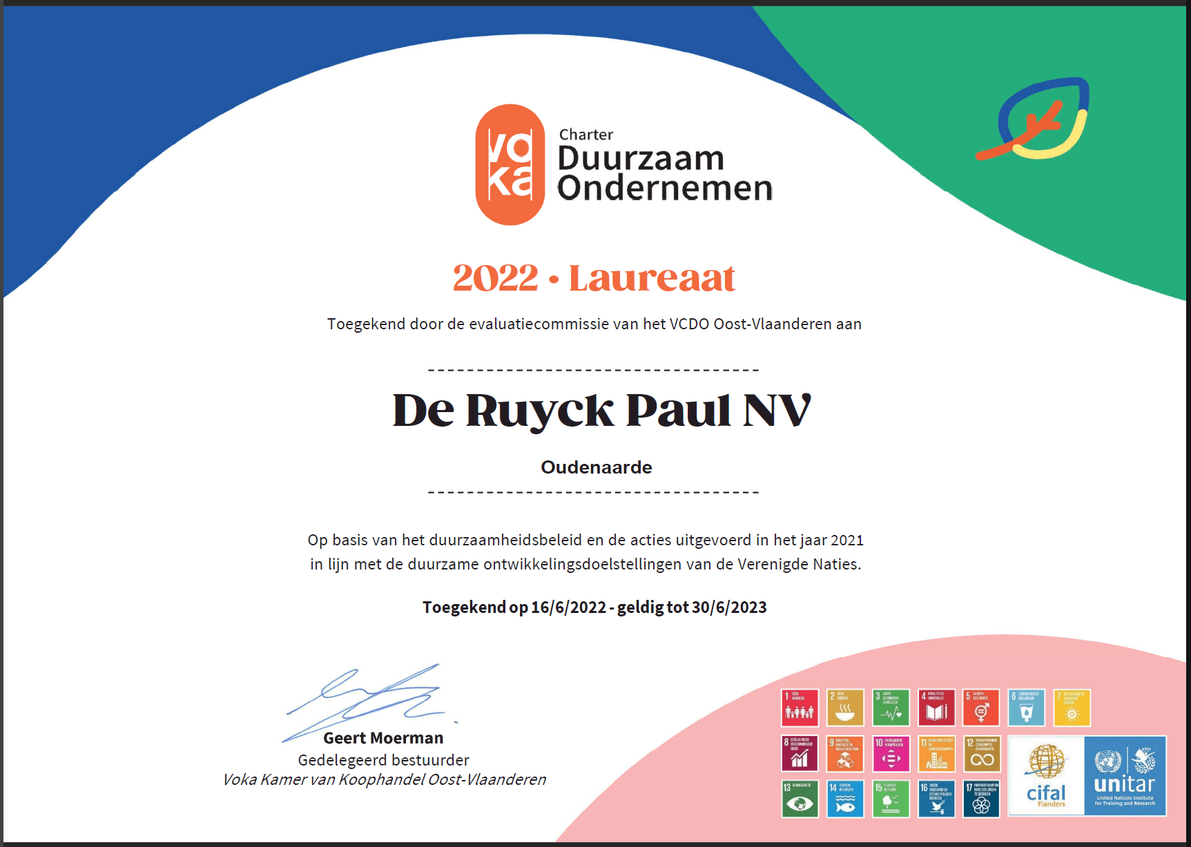 Sinds 2021 doet De Ruyck mee aan het VOKA Charter Duurzaam Ondernemen. Hiervoor werken we een jaaractieplan met minstens 10 duurzaamheidsacties uit, vertrekkende vanuit de 5 pijlers van duurzaamheid (People, Prosperity, Peace, Partnership & Planet) en de 17 SDG's.